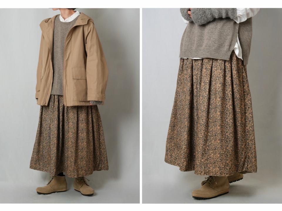 |03 細畝コーデュロイにフラワープリントが目を惹くギャザースカート