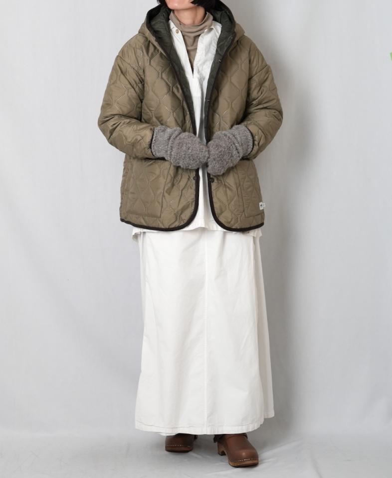 暖かさのある一枚に、ミトンを合わせて手元までしっかり防寒。