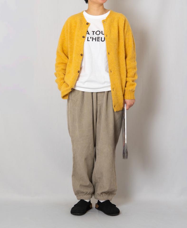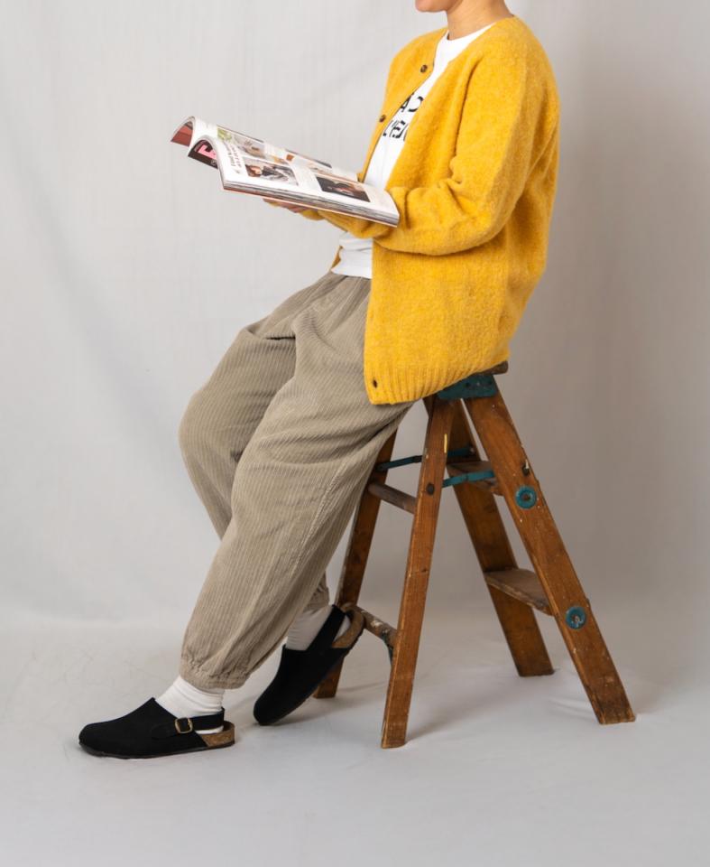 コーデュロイで程よい厚地のパンツを合わせた、
